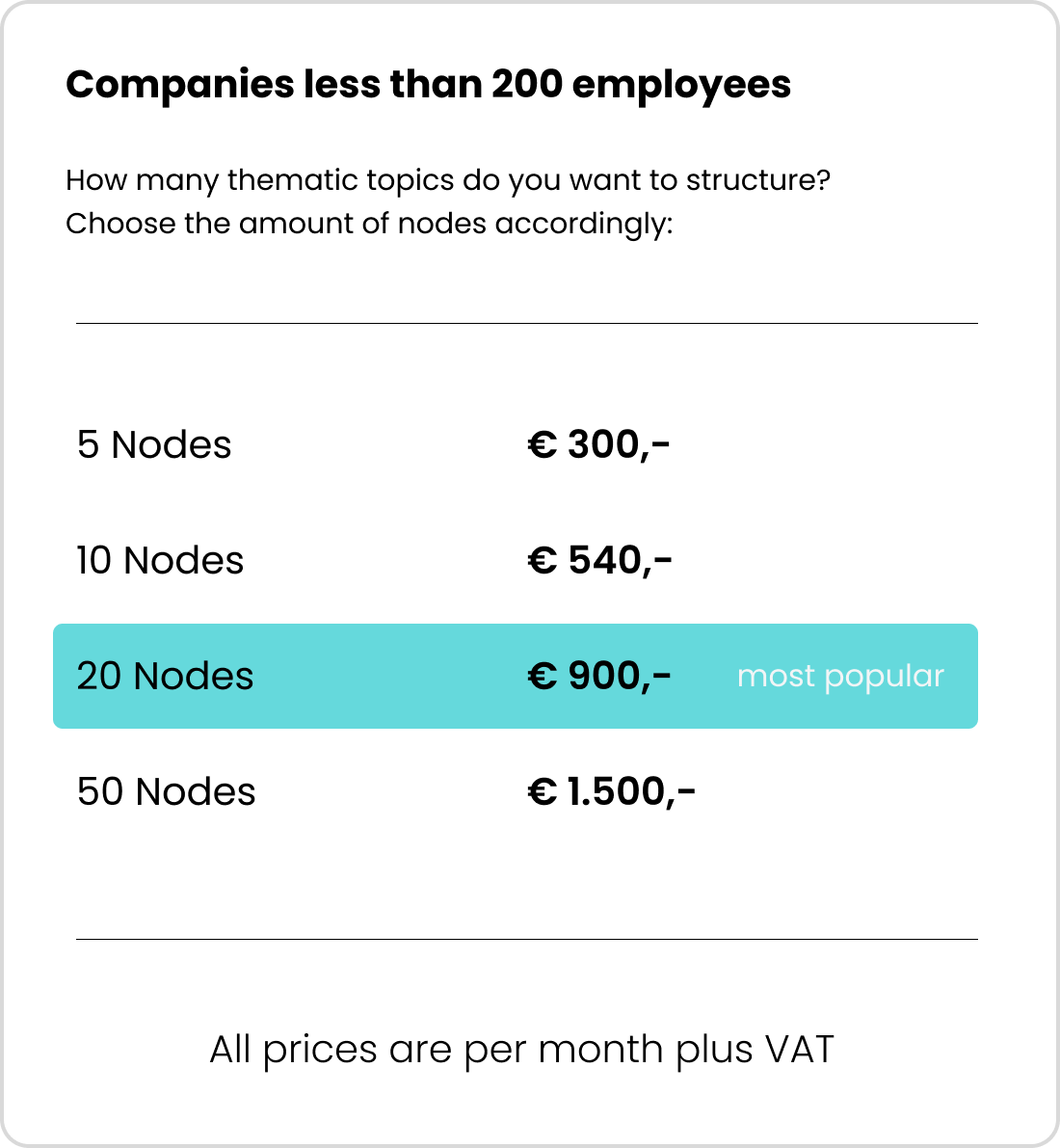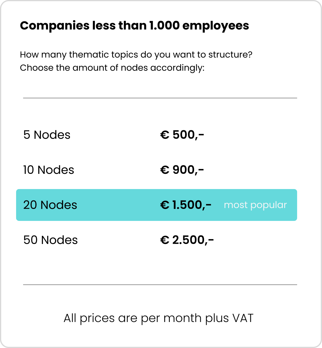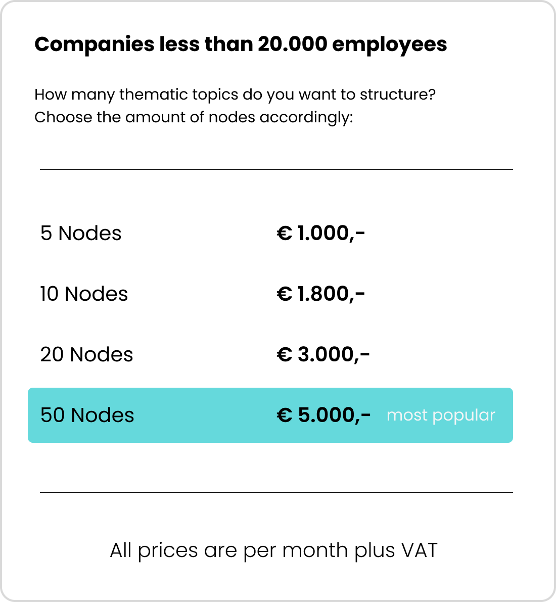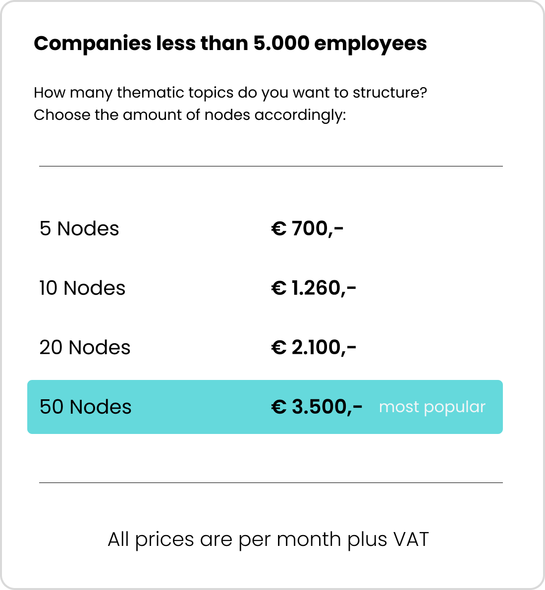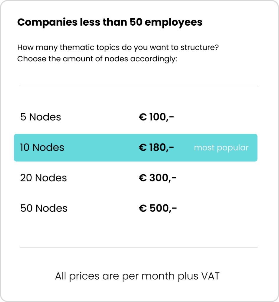Nodes are the themes your brand wants to build authority around – such as core topics like Employer Branding, Sustainability, Innovation Culture or sub topics such as specific products or services.